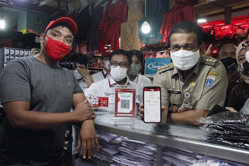 IDXChannel - Wali Kota Jakarta Timur, M. Anwar (kanan) menunjukkan transaksi menggunakan JakOne Mobile didampingi oleh Direktur Ritel & Syariah Bank DKI, Babay Parid Wazdi (tengah) di sela-sela acara digitalisasi transaksi di Pasar Perumnas Klender bersama Bank Indonesia Perwakilan DKI Jakarta, Senin (27/6/2022).