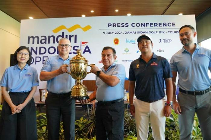 IDXChannel - (Kiri-kanan) Direktur PT Damai Indah Golf S Christine Wiradinata, Direktur Hubungan Kelembagaan Bank Mandiri Rohan Hafas, Ketua Umum Persatuan Golf Indonesia (PGI) Japto Soerjosoemarno, Pegolf Professional Terbaik Indonesia saat ini Jonathan Wijono, dan Commissioner & CEO Asian Tour Cho Minn Thant menunjukkan trofi Mandiri Indonesia Open 2024 usai konferensi pers di Jakarta, Selasa (9/7/2024).