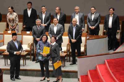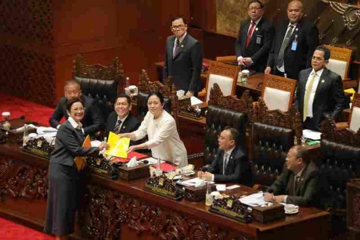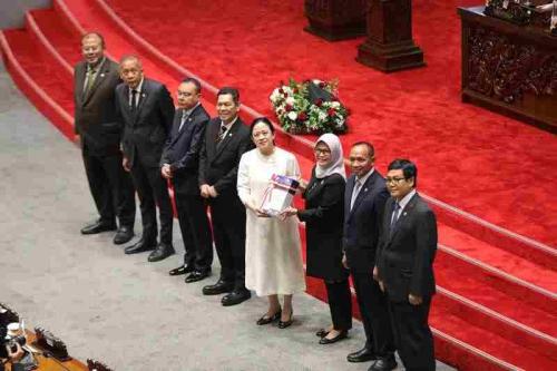 IDXChannel - Ketua DPR Puan Maharani bersama Wakil Ketua DPR Sufmi Dasco Ahmad, Adies Kadir, Saan Mustofa dan Cucun Ahmad Syamsurijal berfoto dengan Ketua BPK Isma Yatun saat Rapat Paripurna ke-19 Masa Persidangan III Tahun Sidang 2024-2025 di Kompleks Parlemen, Senayan, Jakarta, Selasa (27/5/2025).