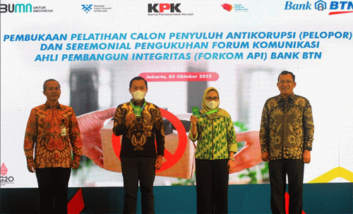 Untuk mendukung gerakan anti korupsi dan penegakan integritas di lingkungan kerja BTN, Bank BTN menggelar pelatihan calon Penyuluh Anti Korupsi (Pelopor) dan Pengukuhan Forkom API BTN yang diikuti pegawai dan Ikatan Istri Karyawan dan Pegawai Bank BTN.