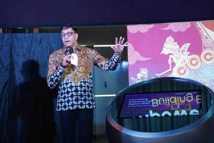 Wakil Menteri Komdigi, Nezar Patria menyampaikan sambutan saat peluncuran Empowering Indonesia Report 2025 di Jakarta, Senin (27/10/2025). Pemerintah Indonesia menargetkan pertumbuhan ekonomi hingga 8% dan status negara berpenghasilan tinggi pada 2030 sebagai bagian dari visi Asta Cita. Salah satu pendorong utama pencapaian tersebut ialah pemanfaatan kecerdasan artifisial (AI) yang berdaulat. Menyadari hal ini, Indosat bersama Twimbit, perusahaan riset dan konsultasi, meluncurkan Empowering Indonesia Report 2025 bertema Building Bridges of Tomorrow, yang menegaskan pentingnya sovereign AI atau AI berdaulat sebagai fondasi utama pertumbuhan ekonomi digital Indonesia.