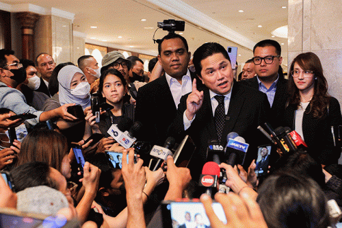 IDXChannel - Menteri BUMN Erick Thohir menemui wartawan usai resmi terpilih menjadi Ketua Umum PSSI di Jakarta, Kamis (16/2/2023).
