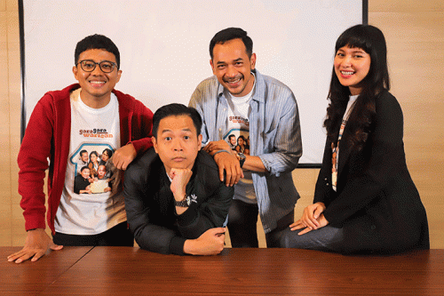 IDXChannel - (kiri kekanan) Sutradara film 'Gara-Gara Warisan' Muhadkly Cho, Produser film 'Gara-Gara Warisan' Ernest Prakasa, Oka Antara, dan Indah Permatasari saat kunjungan film 'Gara-Gara Warisan' di Gedung Sindo, MNC Center, Kebon Sirih, Jakarta Pusat, Kamis (14/4/2022).