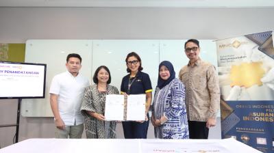 IDXChannel - (Kiri-kanan) Kepala Bidang Teknologi PT MNC Life Assurance Budi Jatmiko, Direktur Keuangan PT MNC Life Assurance Luddin Panjaitan, Direktur Keuangan PT MNC Life Assurance Risye Dillianti, Direktur Keuangan PT MNC Life Assurance Putu Swasti, dan Pimpinan Dayyan Wellness Rina Novita, berfoto bersama usai penandatanganan nasa kerja sama antara MNC Life dengan Dayyan Wellness Hub, di Jakarta, Rabu (12/2/2025).