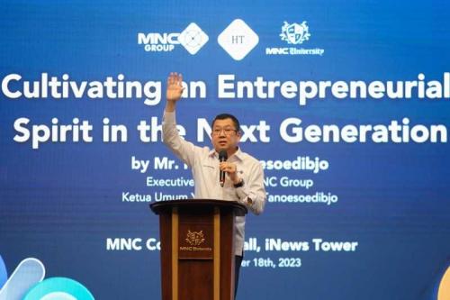 IDXChannel - Executive Chairman MNC Group Hary Tanoesodibjo berbicara di depan ratusan mahasiswa baru pada kuliah perdana MNC University di MNC Confrence Hall, iNews Tower, Senin (19/9/2023).