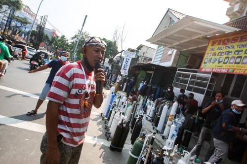 IDXChannel - Karyawan toko saat memberikan arahan kepada warga yang akan mengisi ulang tabung oksigen, dia mengancam tidak akan melayani selama warga masih berkerumun di kawasan Manggarai, Jakarta Selatan, Selasa (6/7/2021).