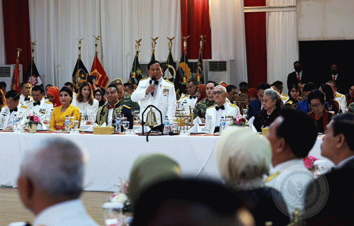 “Kita berkumpul pada upacara penurunan bendera dalam rangka menyongsong hari kelahiran TNI ini intinya adalah untuk mengikat kembali jiwa korsa kita dan kebanggaan kita sebagai bagian dari TNI, untuk mengenang komandan dan senior kita yang sudah tidak bersama kita, menghormati pengorbanan para pendahulu kita,” kata Prabowo.