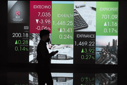 IDXChannel - Pengunjung melintas di layar Pergerakan Indeks Harga Saham Gabungan (IHSG), BEI, Selasa (17/5/2022).