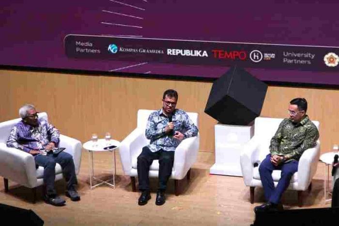 IDXChannel - (Kiri - kanan) President Director and CEO Indosat Vikram Sinha, Menteri Komunikasi dan Digital Meutya Hafid, Wakil Menteri Komunikasi dan Digital Nezar Patria dan CEO GoTo Group Patrick Walujo meluncurkan Sahabat-AI 70 Miliar Parameter dengan Layanan Chat Multibahasa di Jakarta, Senin (2/6/2025).
