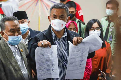 IDXChannel - Ketua Komisi C DPRD DKI Jakarta Rasyidi (Kiri) didampingi sejumlah anggota DPRD DKI Jakarta mengajukan permohonan hak mereka untuk menginterpelasi Gubernur DKI Jakarta Anies Baswedan kepada Ketua DPRD, Prasetio Edi Marsudi (tengah) di Balai Kota, Jakarta, Kamis (26/8/2021).
