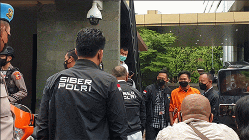 Doni dibawa oleh penyidik ke lokasi konferensi pers dengan mengenakan baju tahanan berwarna oranye.