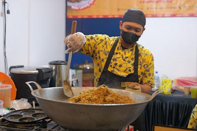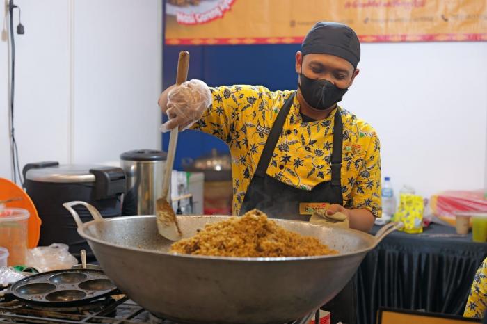 Sejumlah booth tampak ramai dengan antrean, baik di area indoor maupun outdoor, menandakan tingginya minat pengunjung terhadap ragam kuliner yang tersedia. Area makan juga dipenuhi pengunjung yang beristirahat bersama keluarga maupun rekan.