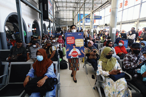 IDXChannel - Petugas KAI Commuter memegang poster saat melakukan kampanye cegah tindak kekerasan dan pelecehan seksual di Stasiun Tanah Abang, Jakarta, Rabu (29/6/2022).