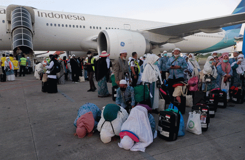 IDXChannel - Para jamaah haji turun dari pesawat di Bandara Internasional Sultan Hasanuddin, Maros, Kamis (28/7/2022).