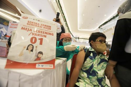 Maju khusus untuk vaksinasi Covid-19 bagi anak dan vaksin booster di Mal Neo Soho, Jakarta Barat.