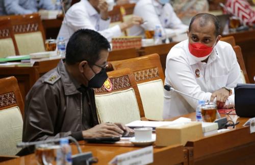 IDXChannel - Wakil Jaksa Agung Setia Untung Arimuladi (kiri) dan Wakil Menteri Hukum dan HAM Edward Omar Sharif Hiariej (kanan) saat mengikuti rapat kerja dengan Komisi III DPR RI di Kompleks Parlemen, Senayan, Jakarta, Senin (15/11/2021).