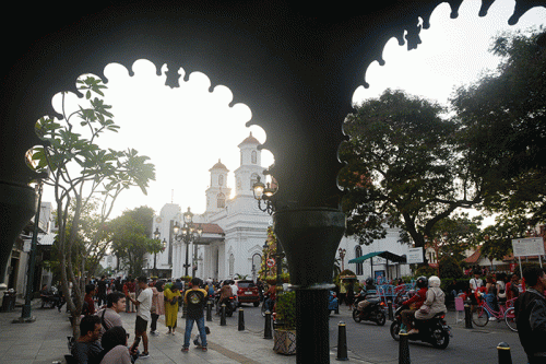 IDXChannel - Sejumlah wisatawan berswafoto dengan latar belakang bangunan kuno dan bersejarah di kawasan Kota Lama Semarang, Jawa Tengah, Selasa (25/4/2023).