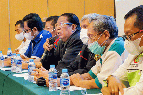 IDXChannel - Wakil Ketua KSPSI Matias Tambing (tengah) bersama pengurus memberikan keterangan disela HUT ke-49 dan Kongres X KSPSI di Jakarta, Minggu (20/2/2022).