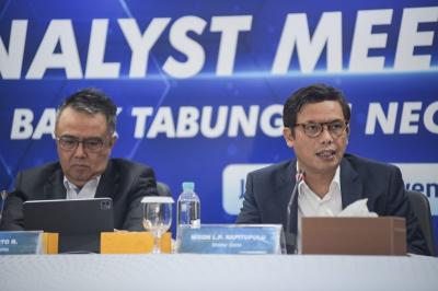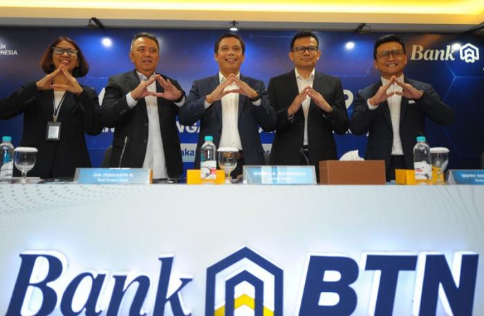 IDXChannel - Direktur Utama PT Bank Tabungan Negara (Persero) Tbk. Nixon LP Napitupulu (ketiga kiri) didampingi Jajaran Direksi Bank BTN Elisabeth Novie Riswanti (kiri), Oni Febriarto R (kedua kiri), Nofry Rony Poetra (kedua kanan), dan Setiyo Wibowo (kanan) hadir pada Analyst Meeting di Jakarta, Senin (27/11/2023).