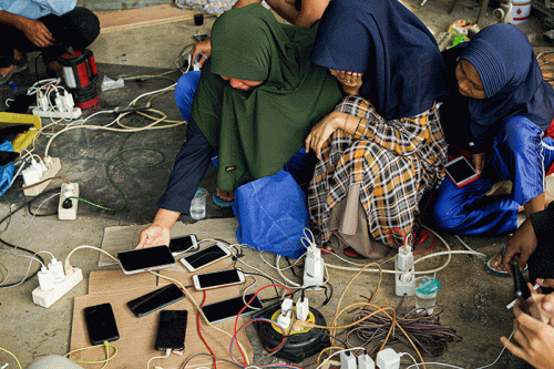 Terlihat, para remaja tengah ramai melingkari terminal listrik. Mereka, duduk dengan tertib menunggu daya ponselnya terisi penuh.
