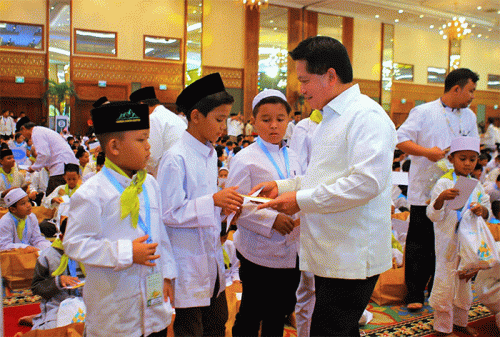 IDXChannel - Direktur Utama BSI Hery Gunardi saat berbagi santunan kepada anak yatim pada momentum BSI THR Yatim di di Assembly Hall Jakarta Convention Center, Jakarta, Jumat (14/4/2023).