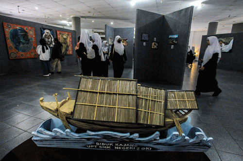 Pengunjung menyaksikan berbagai karya lukisan dan kriya yang mengeksplorasi pemandangan, seni dan budaya daerah, dan karya seni yang terbuat dari sampah.