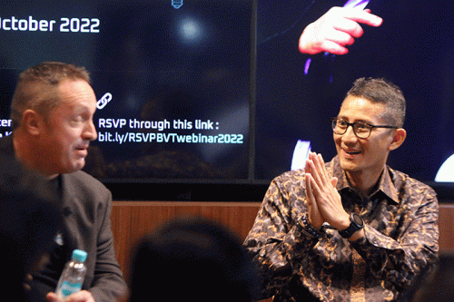 IDXChannel - (Dari Kiri ke Kanan) Founder and Investor of Bhumi Varta Technologi Martyn Terpilowski, Menparekraf Sandiaga Uno dan Moderator Sara Wayne menjadi pembicara dalam diskusi yang berlangsung di Centennial Tower, Jakarta, Kamis (27/10/2022).