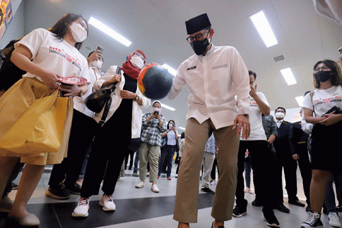 IDXChannel - Menteri Pariwisata dan Ekonomi Kreatif Sandiaga Uno meninjau pameran lukisan dari komunitas disabilitas (kolaborasi kitaoneus & MRT Jakarta), di Stasiun MRT Bundaran HI, Jakarta, Jumat (24/6/2022).