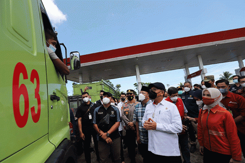 IDXChannel - Menteri Energi dan Sumber Daya Mineral (ESDM) Arifin Tasrif (kiri) didampingi Gubernur Bengkulu Rohidin Mersyah (tengah) dan Direktur Utama PT Pertamina (Persero) Nicke Widyawati (kanann) berbincang dengan sopir truk saat melakukan sidak di SPBU 24.38216, Betungan, Bengkulu, Sumatera Barat, Minggu, (10/3/22).
