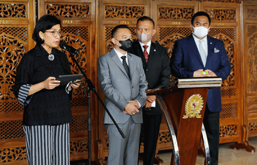 IDXChannel - Menteri Keuangan Sri Mulyani (kanan) menyampaikan laporan disaksikan Wakil Ketua DPR Rachmad Gobel (kedua kanan), Ahmad Sufmi Dasco (kedua kiri), dan Lodewijk Freidrich Paulus (kiri) saat Rapat Paripurna DPR RI ke-22 di Kompleks Parlemen, Jakarta, Jumat (20/5/2022).