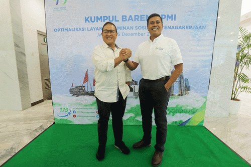 IDXChannel - President Director PT MNC Kapital Indonesia Tbk & CTO MNC Group Yudi Hamka (kiri) dan Direktur Utama BPJS Ketenagakerjaan Anggoro Eko Cahyo berjabat tangan saat menghadiri acara Pembukaan Rekeneing Massal Pekerja Migran Indonesia (PMI) di Plaza BP Jamsostek, Jakarta, Kamis (15/12/2022).