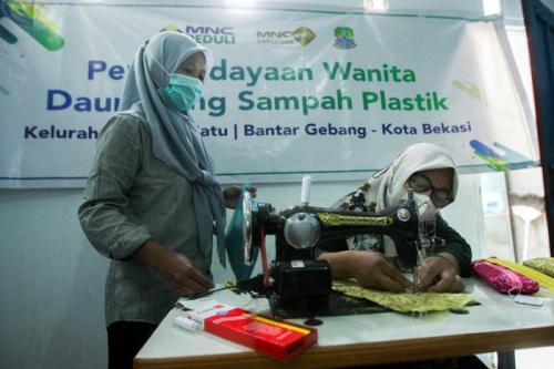 MNC Peduli bersama MNC Sekuritas mengajak ibu-ibu PKK di Sumur Batu, Bantar Gebang mengolah sampah kemasan plastik menjadi barang yang bernilai.
