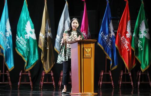 IDXChannel - Ketua Yayasan MNC University Jessica Tanoesoedibjo dalam acara Pengenalan Kehidupan Kampus Mahasiswa Baru (PKKMB) MNC University di iNews Tower, Jakarta, Selasa (14/10/2025).