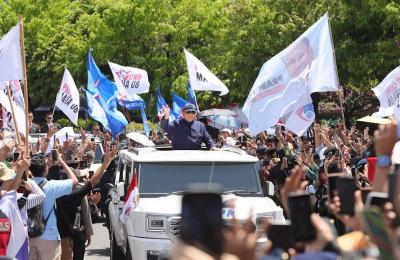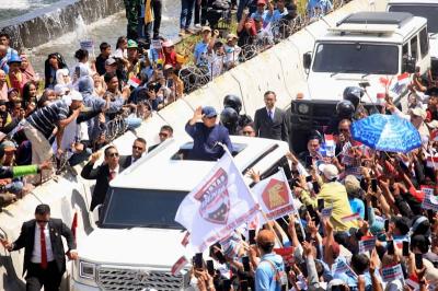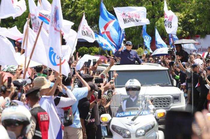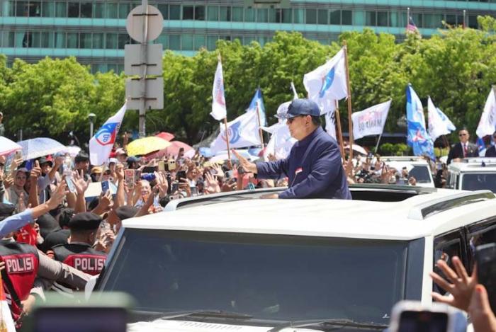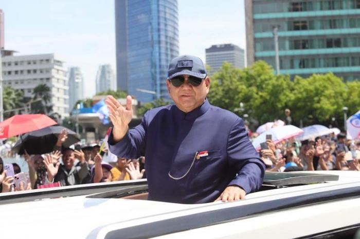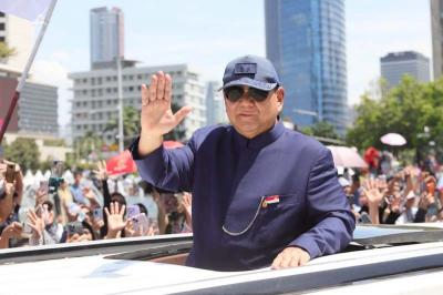 IDXChannel - Presiden RI Prabowo Subianto menaiki mobil produksi Pindad Maung Garuda menyapa warga saat melintas di kawasan Bundaran HI, Jakarta, Minggu (20/10/2024).