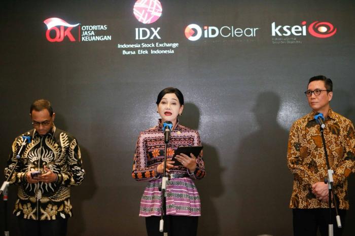 IDXChannel - (Ki-Ka) Pengganti Kepala Eksekutif Pengawas Pasar Modal, Keuangan Derivatif dan Bursa Karbon OJK Hasan Fawzi, Pjs Ketua Dewan Komisioner Otoritas Jasa Keuangan (OJK) Friderica Widyasari Dewi, dan Pjs Direktur Utama PT Bursa Efek Indonesia (BEI) Jeffrey Hendrik pada konferensi pers mengenai perkembangan terkini terkait MSCI di Gedung Bursa Efek Indonesia, Jakarta, Jumat, (20/2/2026).