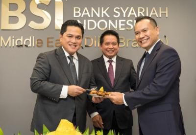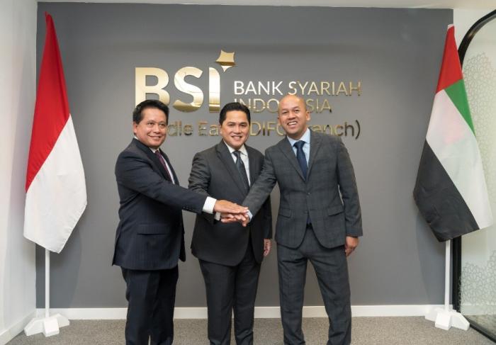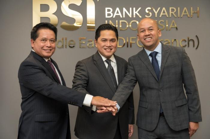 IDXChannel - Direktur Utama BSI Hery Gunardi (kiri), Menteri BUMN Erick Thohir (tengah), dan Direktur Keuangan dan Strategi BSI Adi Cahyo Nugroho (kanan) hadir pada tasyakuran perolehan izin usaha kantor cabang penuh BSI di Dubai International Financial Center (DIFC), Dubai, Uni Arab Emirates, Rabu (29/11/2023).