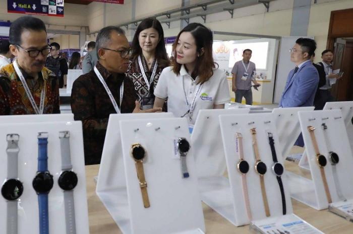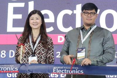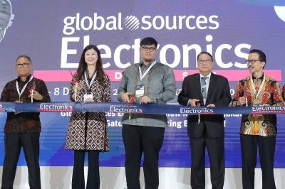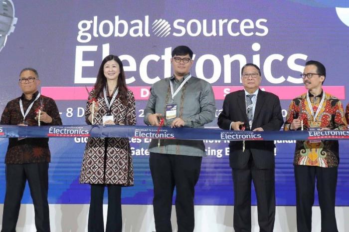 IDXChannel - Presiden Direktur PT Adhouse Clarion Events Toerangga Putra (kanan) didampingi Wakil Presiden Global Sources Exhibitions Wendy Lai membuka pameran Global Sources Electronics Indonesia (GSEI) 2023 di Jakarta Convention Center (JCC), Jakarta, Rabu (6/12/2023).