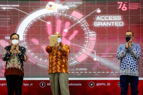 IDXChannel - Ketua KPU Ilham Saputra (tengah), Komisioner KPU I Dewa Kade Wiarsa Raka Sandi (Kiri) dan Hasyim Asy saat meluncurkan Soft Launching program Desa Peduli Pemilu dan Pemilihan di Kantor KPU RI Jakarta, Jumat (20/8/2021).