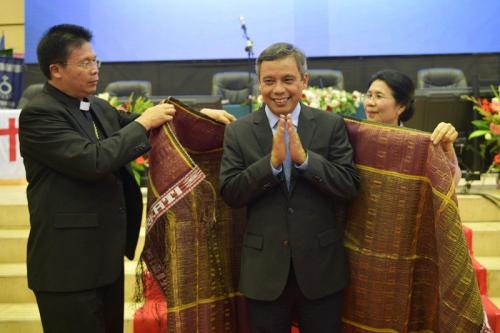 IDXChannel - Direktur Utama BTN Nixon LP Napitupulu disaksikan Ompui Ephorus HKBP, Pdt. Victor Tinambunan memakai kain ulos saat peluncuran Tabungan BTN-HKBP di Auditorium HKBP Seminarium Sipoholon, Tapanuli Utara (Taput), Sumatera Utara, Selasa (28/10/2025).