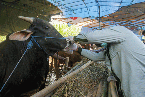Dalam pemeriksaan ditemukan 6 sapi positif memiliki gejala sariawan di mulut, mengeluarkan air liur banyak atau hipersalivasi, dan bengkak pada tracak. Atas temuan tersebut, dinas terkait melakukan pengobatan, perawatan, sekaligus isolasi di kandang selama 14 hari.
