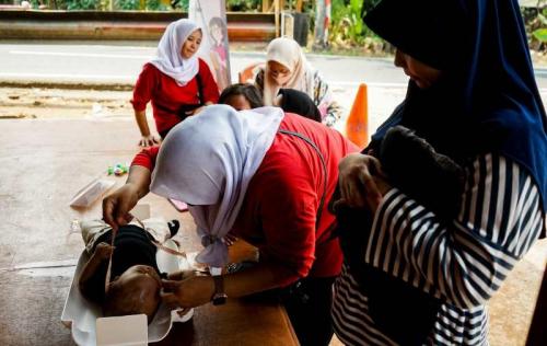 IDXChannel - Tenaga medis melakukan pemeriksaan kesehatan dan tumbuh kembang anak saat pelaksanaan Pos Pelayanan Keluarga Berencana Kesehatan Terpadu (Posyandu) di Srengseng Sawah, Jakarta Selatan, Selasa (22/8/2023).