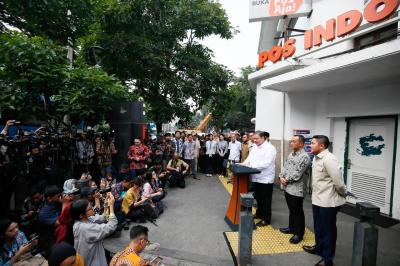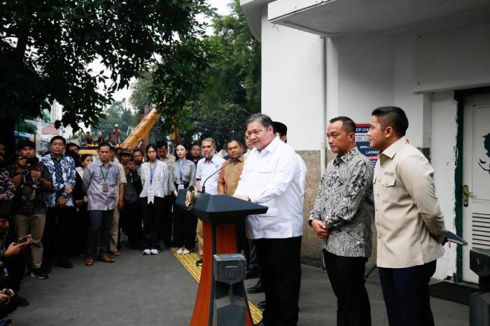 IDXChannel - Menko Perekonomian Airlangga Hartarto (ketiga kanan) didampingi Mensos Saifullah Yusuf (tengah), Mensesneg Prasetyo Hadi (kedua kanan), Seskab Teddy Indra Wijaya (kanan), Wamenaker Afriansyah Noor (ketiga kiri) dan Kepala BKP Angga Raka Prabowo (kedua kiri) memberikan pengumuman paket stimulus ekonomi di Kantor Pos Cikini, Jakarta, Jumat (17/10/2025).