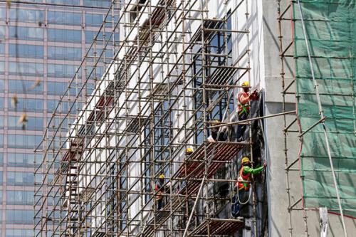 IDXChannel - Pekerja saat menyelesaikan proyek pemugaran Gedung Sarinah di Jalan MH Thamrin, Jakarta Pusat, Sabtu (18/9/2021).