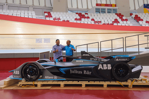 IDXChannel - Ketua Pelaksana Formula E Jakarta Ahmad Sahroni bersama Managing Director Organizing Committee Jakarta E-Prix 2022 Widi Amanasto melihat replika mobil Formula E di Jakarta International Velodrome, Rawamangun, Jakarta Timur, Kamis (26/5/2022).