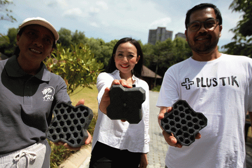 IDXChannel - (Dari Kiri ke Kanan) Operation Manager Taman Wisata Alam Mangrove Angke Kapuk Ratih Maduretno, Country Head PT Samsonite Indonesia Nadya Pertiwi, dan Founder PlusTik Reza Hasfinanda berfoto bersama usai seremoni pengaspalan Paving Block Daur Ulang Samsonite di Taman Wisata Alam Mangrove Angke Kapuk, Jakarta, Kamis (15/12/2022).