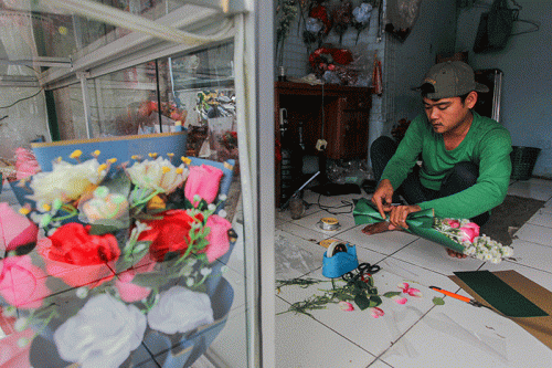IDXChannel - Penjual bunga saat membuat pesanan bucket mawar di Jalan Raya Pondok Gede, Jakarta Timur, Selasa (14/2/2023).
