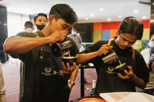 IDXChannel - Sejumlah peserta bersaing menyajikan kopi dalam acara “Come Together Barista” di Merlynn Park Hotel, Jakarta, Rabu (22/6/2022).