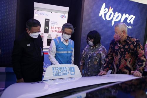 IDXChannel - Direktur Niaga dan Manajemen Pelanggan PT PLN (Persero) Bob Saril, Direktur Corporate Banking PT Bank Mandiri (Persero) Tbk. Susana Indah K Indriati, Direktur Hubungan Kelembagaan Rohan Hafas, Direktur Treasury & International Banking Panji Irawan, dan SEVP Corporate Banking Arief Ariyana berbincang-bincang usai peresmian pengoperasian Stasiun Pengisian Kendaraan Listrik Umum (SPKLU) Plaza Mandiri di Jakarta, Senin (10/1/2022).