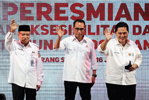 IDXChannel - Menteri Perhubungan Budi Karya Sumadi (tengah) bersama Menteri BUMN Erick Thohir (kanan) dan Komisaris Utama KAI Said Aqil Siroj menghadiri Peresmian Peningkatan Aksesibilitas dan Penataan Stasiun Pondok Ranji di Tangerang Selatan, Banten, Kamis (16/6/2022).