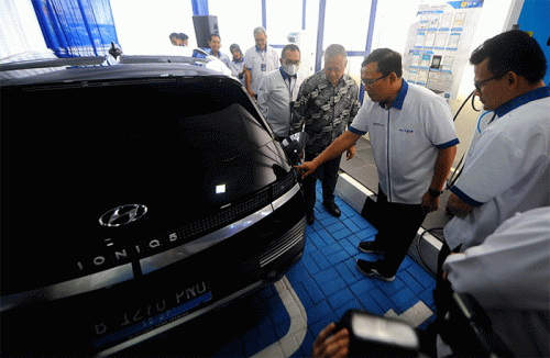 IDXChannel - Direktur Utama Bank BTN Haru Koesmahargyo (kiri keempat) bersama GM PLN UID Jakarta Raya Doddy B Pangaribuan (ketiga kiri) menggunting pita didampingi jajaran direksi Bank BTN saat meresmikan Stasiun Pengisian Kendaraan Listrik Umum (SPKLU) Bank BTN di Jakarta, Rabu (15/3/2023).